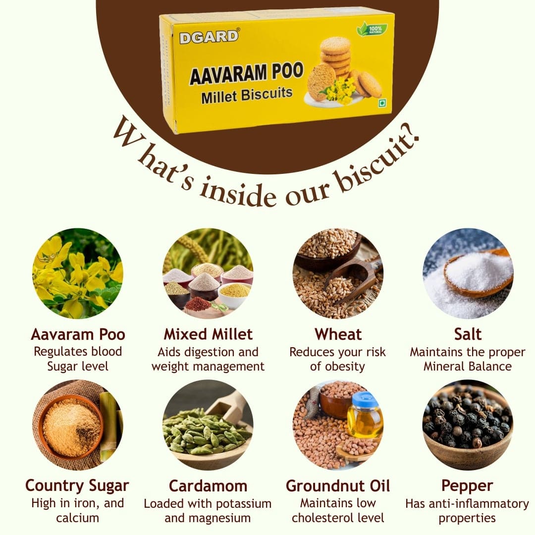 Ingredients: Aavaram Poo, Mixed millet, Wheat, Country sugar, Salt, Pepper, Cardamom and Groundnut oil
