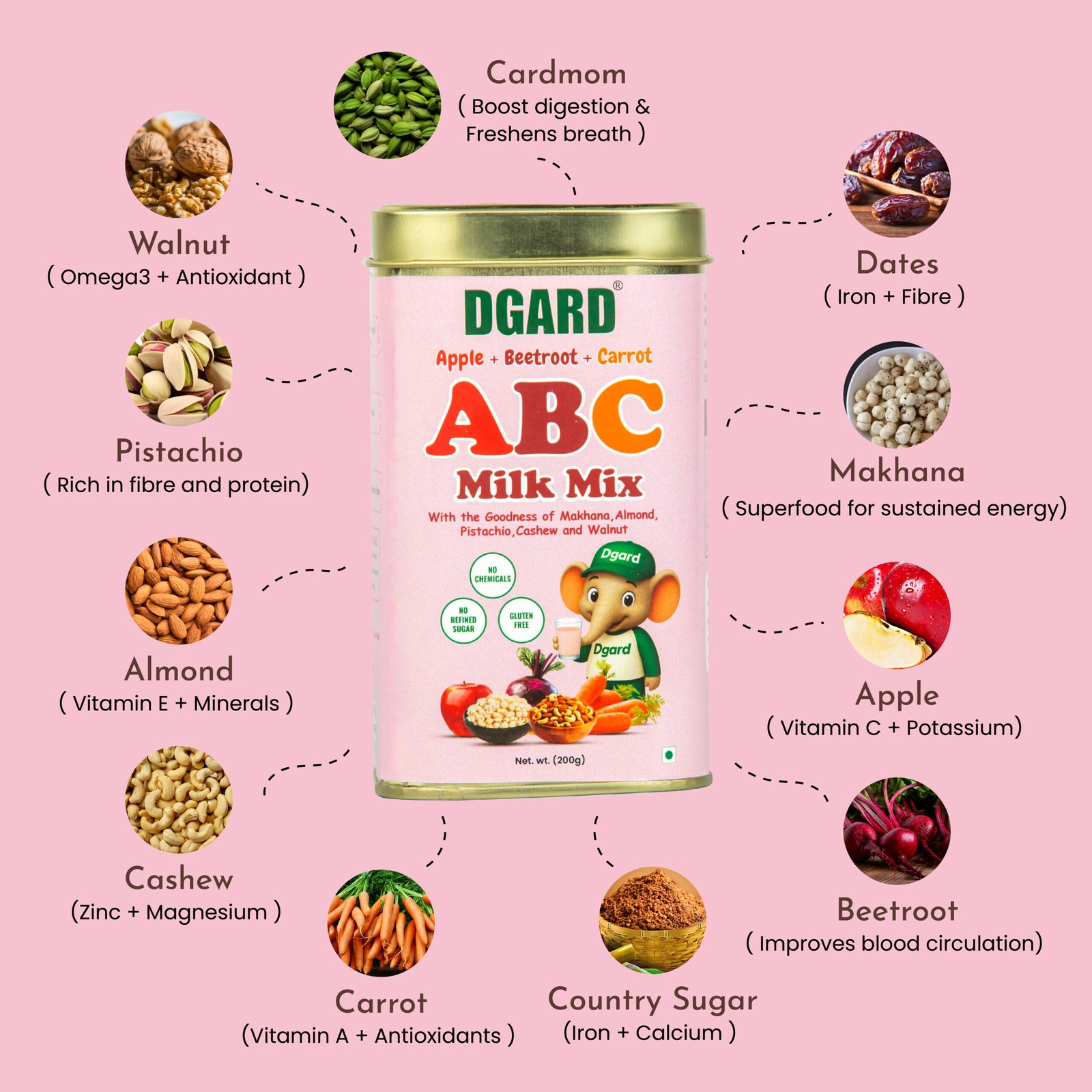 The soft blush-pink in your cup is the first hint this isn’t ordinary milk. Dgard’s ABC Milk Mix blends handpicked apples, beetroots, carrots, and nuts into a smooth, creamy drink with a light touch of cardamom. It’s delicious enough to look forward to every day and nutritious enough to be a regular part of your family’s routine. From the rush of busy mornings to the calm of bedtime, it slips into your day without fuss — a cup before school, a glass after work, or a quick recharge in between.