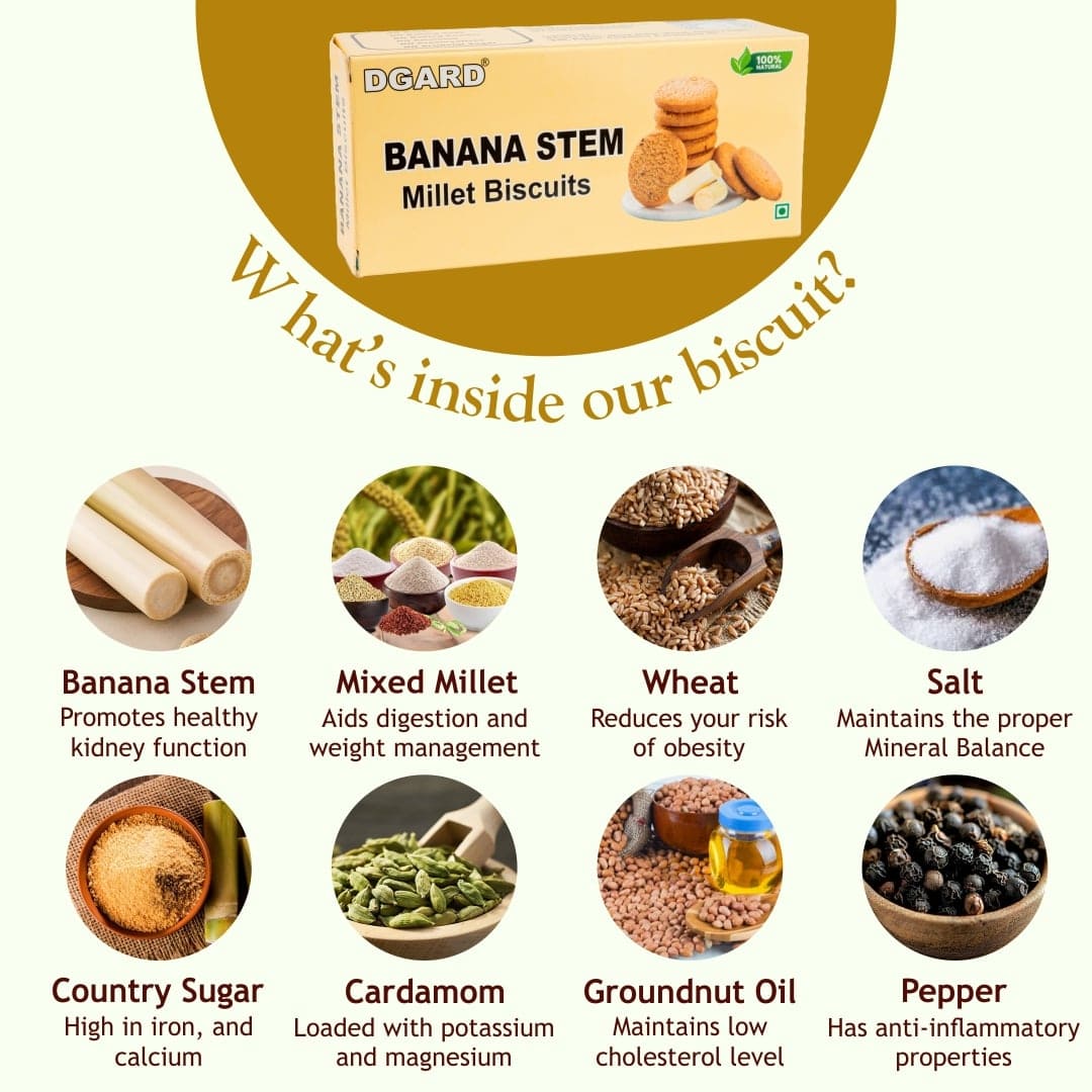 Ingredients: Banana stem, Mixed millet, Wheat, Country sugar, Salt, Pepper, Cardamom, and Groundnut oil