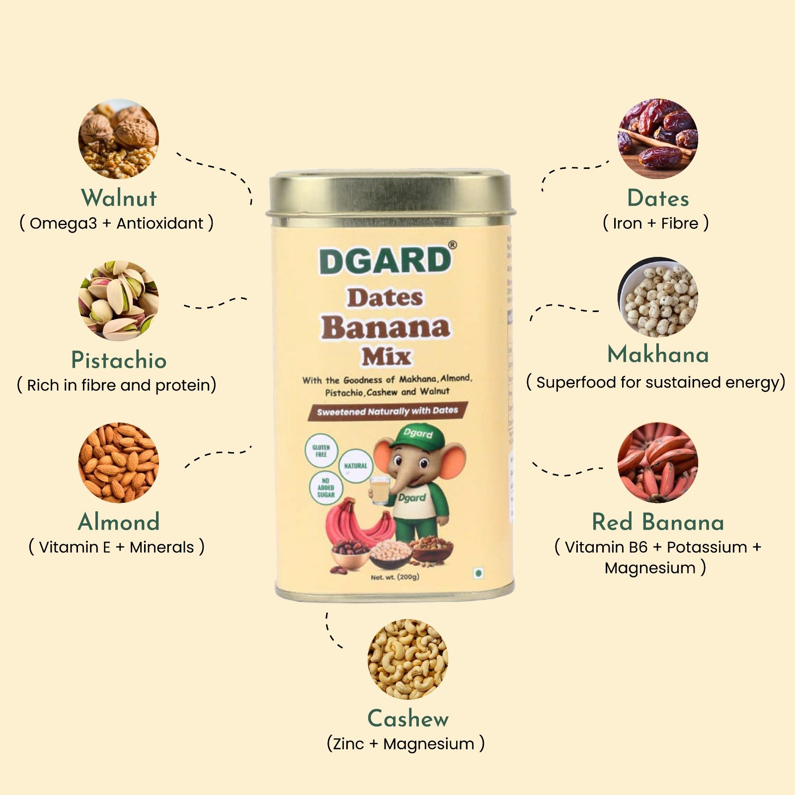 Some drinks taste like comfort from childhood, and Dgard’s Dates Banana Milk Mix brings that feeling back with dates, red banana, and a nutritious blend of almond, cashew, walnut, pistachio, and makhana. The natural iron from dates, the good fats from nuts, and the potassium-rich red banana make this mix a daily booster for immunity and growth.