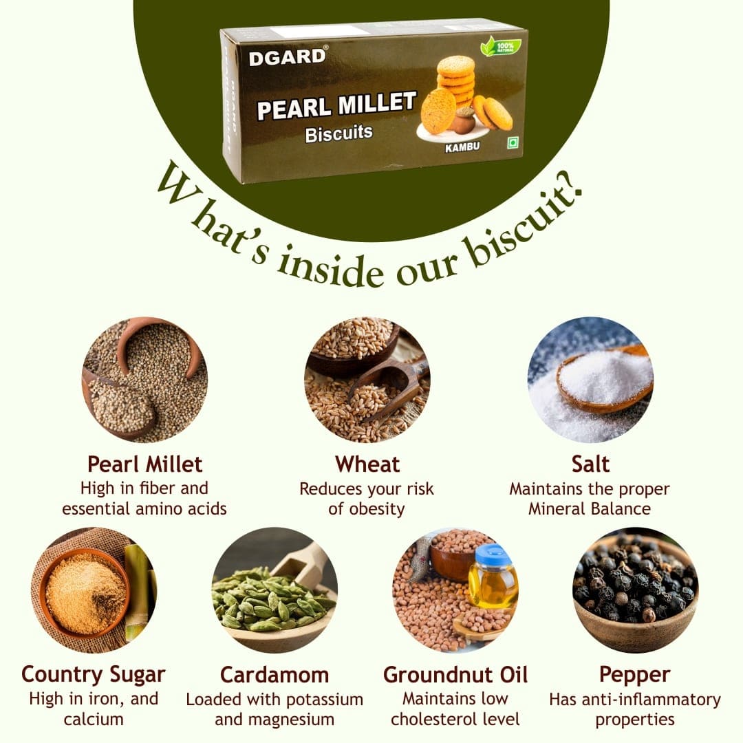 Treat yourself to the pearl millet biscuits packed with fiber and essential nutrients for sustained energy. Made with 100% natural ingredients, free from chemicals and preservatives these biscuits are a smart snacking choice for all ages. Enjoy them with your tea, as a quick pick-me-up, or anytime you crave a nourishing treat!