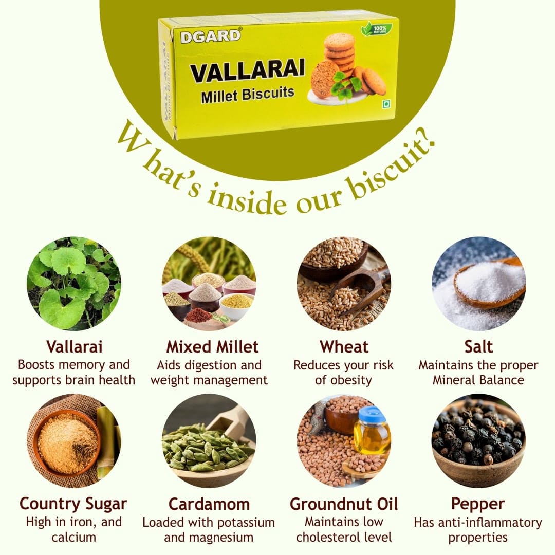 Infused with the goodness of vallarai, these millet biscuits are a perfect blend of tradition and taste. Known for its memory-boosting and antioxidant properties, vallarai adds a subtle herbal essence that pairs beautifully with the crisp texture of millet. Each bite is a wholesome treat, made from natural ingredients—free from refined sugar, preservatives, and artificial additives, delivering only the richness of nature’s finest herbs.